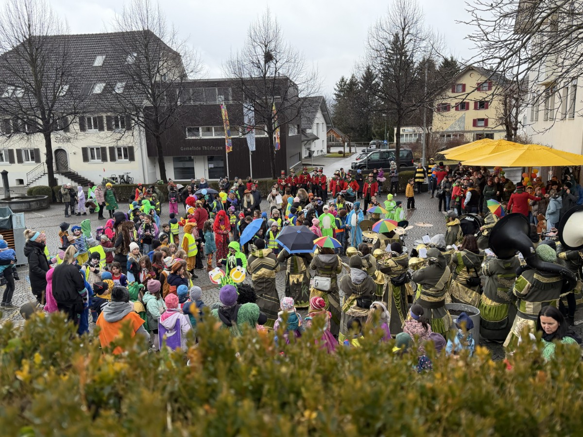 Trotz nicht ganz idealem Wetter fand der Faschingsausklang am Faschingsdienstag, 17. Februar, in fröhlicher Stimmung am Dorfplatz statt. Bereits ab 10:00 Uhr sorgten die Kindergartenkinder mit Musik und Tänzen für ein buntes Programm. Weil das Wetter nicht mitspielte, wurden die Auftritte kurzerhand in die Tiefgarage verlegt – und dort wurde umso ausgelassener weitergetanzt.